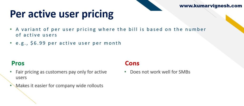 Business Per-Active-user pricing Date: December 15, 2021Author: Vignesh Kumar 0 Comments Day 5 on “SaaS Pricing models” Today let’s discuss the Pros and Cons of the “Per-Active-user pricing” Share this: Click to share on X (Opens in new window) X Click to share on Facebook (Opens in new window) Facebook Like Loading... Related