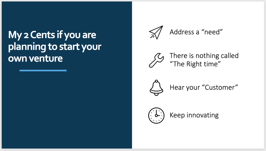 — You don’t start a venture because you want to join the startup bandwagon for the sake of it. For every successful startup, company, or product, the underlying reason for the success is “It addresses a Customer need”. If you are unable to identify a need, your solution will never resonate with the customer. Do not play the catch-up game.
