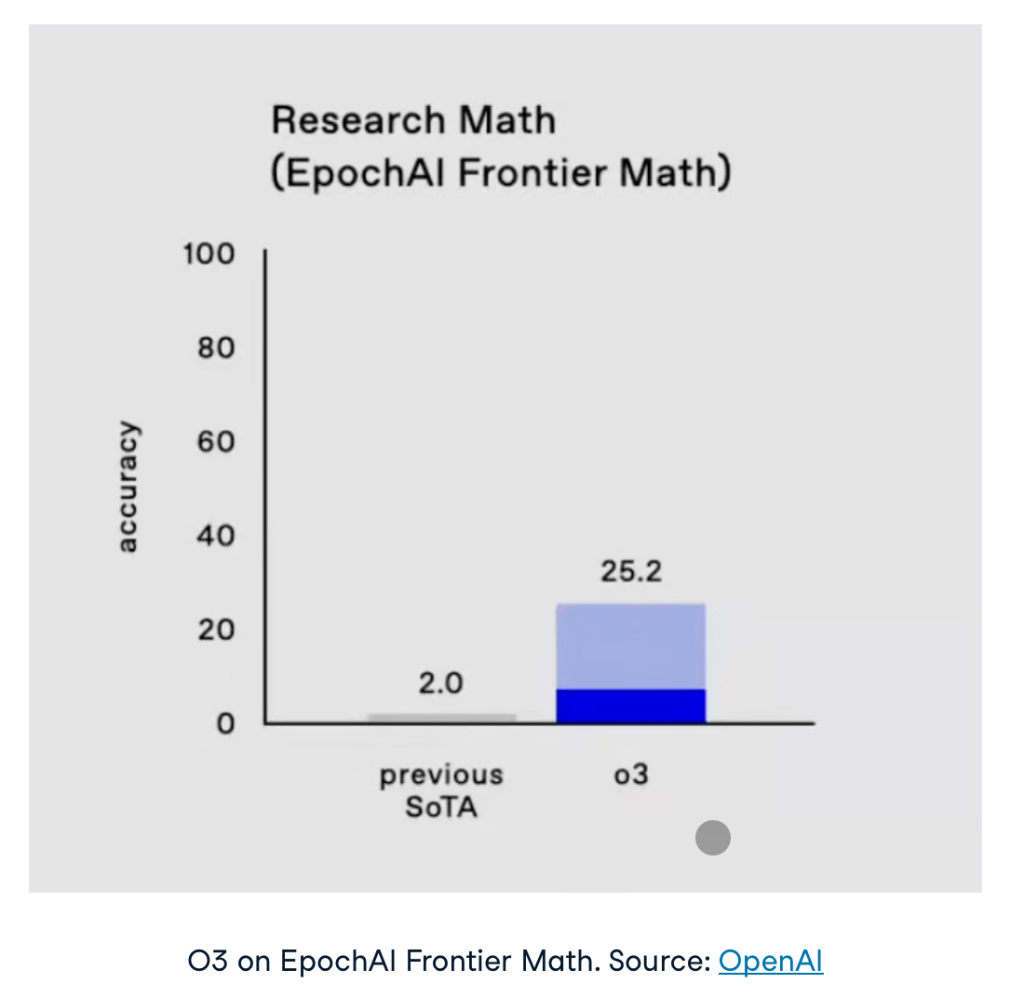 2️⃣ Generalization: On the EpochAI Frontier Math benchmark, which challenges models to solve new, unpublished problems, o3 scored 25.2%. This is a significant leap compared to typical AI scores below 2%. These results highlight o3’s ability to adapt and solve unfamiliar tasks, a key trait of AGI.