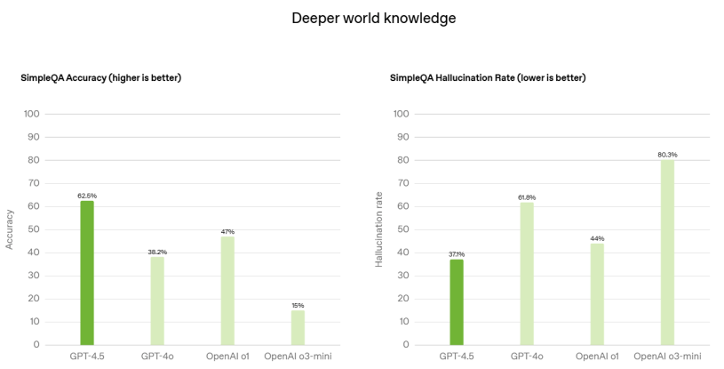 π GPT-4.5 has the lowest hallucination rate so farβ19%, down from 20% in GPT-4oβ. Though just a point drop, it is still significant.