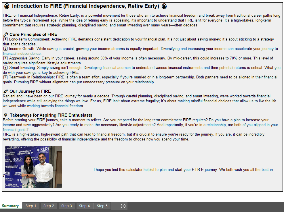 Questions like these can shake your mental peace. When I found myself battling similar negative thoughts, I started building a FIRE calculator for my own use. I wanted to understand how much of a corpus I needed to survive. About three years ago, I created a very simple file to calculate my retirement corpus based on my yearly expenses. What started as a basic exercise slowly evolved into a framework. Over time, I kept refining it to figure out how much I would need to retire, track my net asset value, and plan systematic withdrawals if I lost my income.